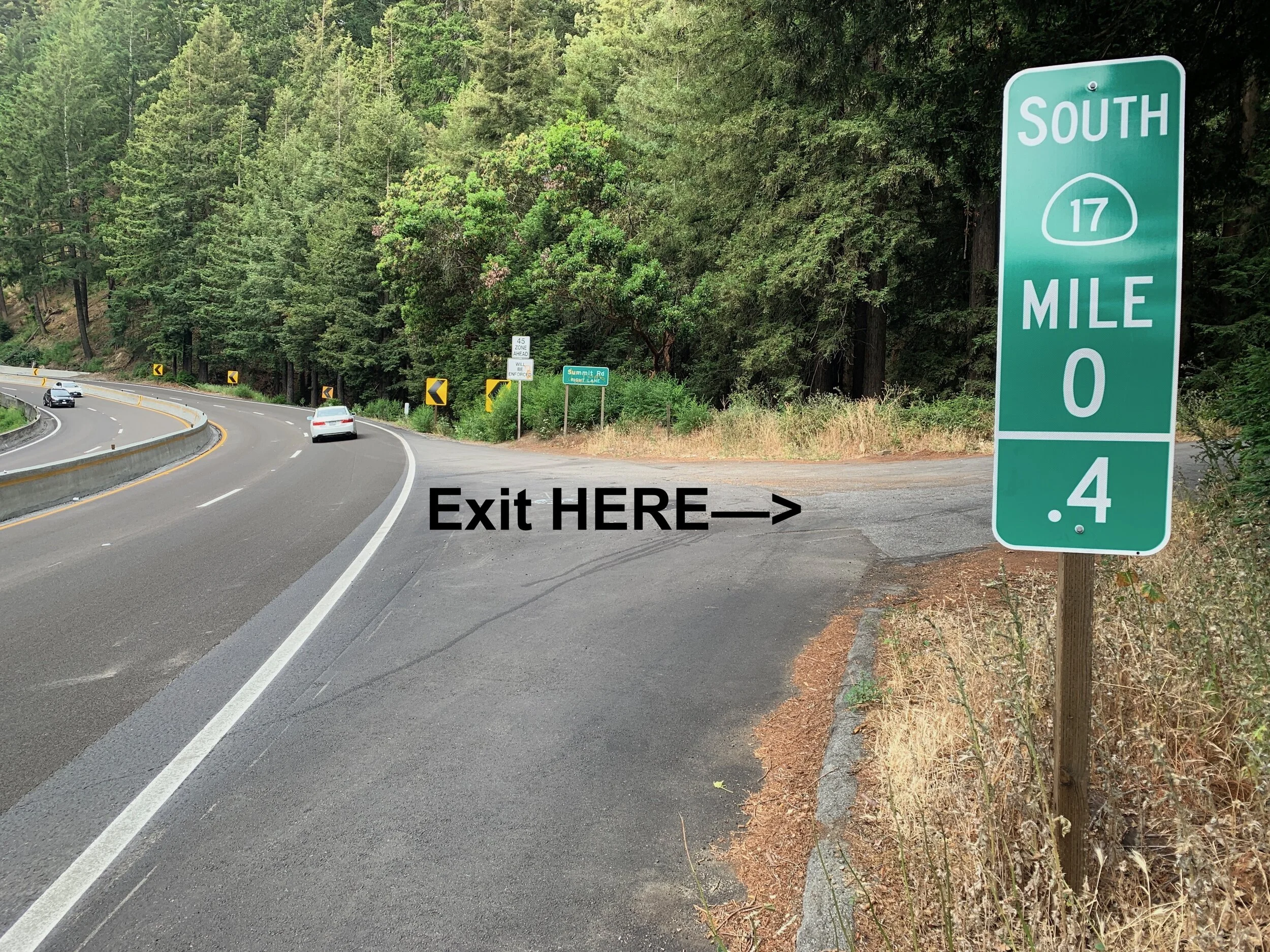 Arriving from the Santa Cruz side (or anywhere on Summit Road), please travel on Hwy-17 Northbound and exit at Redwood Estates. This exit includes a sudden tight turn while exiting the highway, so please drive extra slow. Then follow the road around to the freeway underpass to get back onto Hwy 17 South. Then drive south, toward Santa Cruz, until you see Mile Marker 0.4 as in the above photo.
